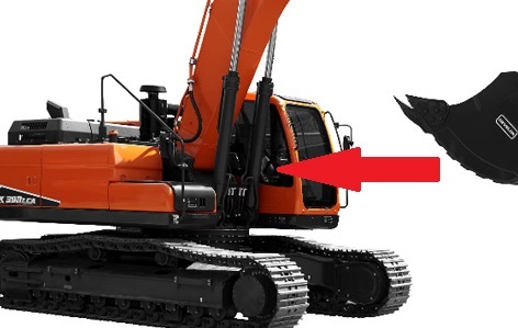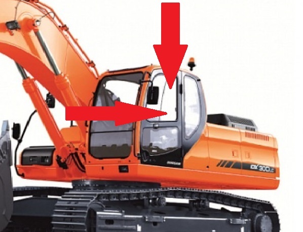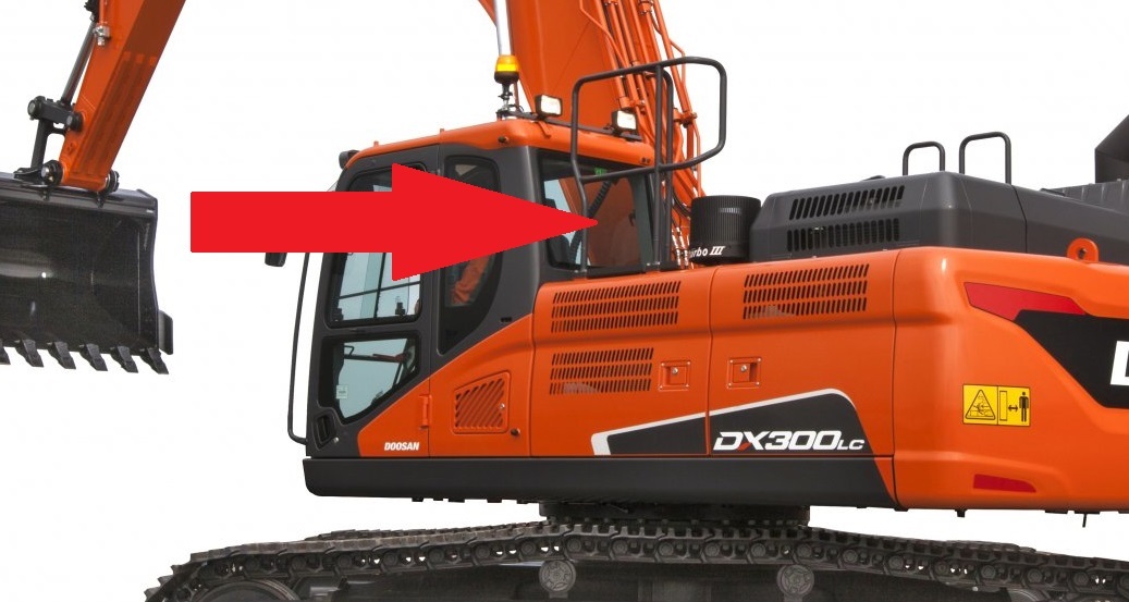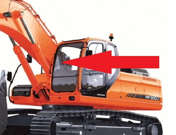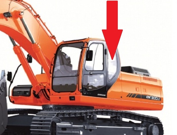Стекло правое возле стрелы (КАЛЁНОЕ) на Doosan DX 300 LCA габаритные размеры 1780х1155мм (с шелкографией)