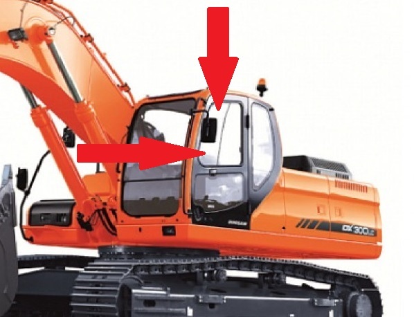 Стекло лобовое верхнее (КАЛЁНОЕ) на Doosan DX 300 LCA габаритные размеры 1035х840мм (с шелкографией)